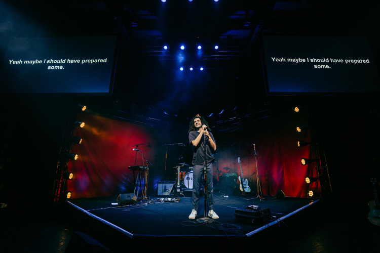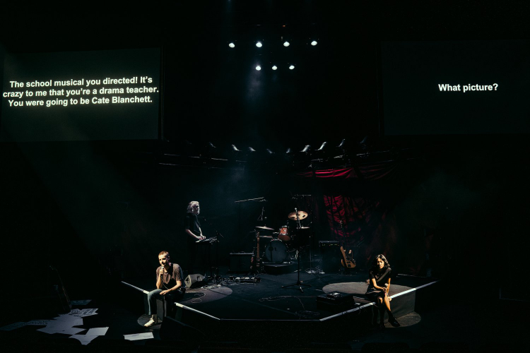Audiences respond to the mix of nostalgia, raucous energy and emotionally impactful storytelling. They enter the theatre to see a set-up that recalls a corner stage at a bar - drum kit, amps, keyboard, red curtains.