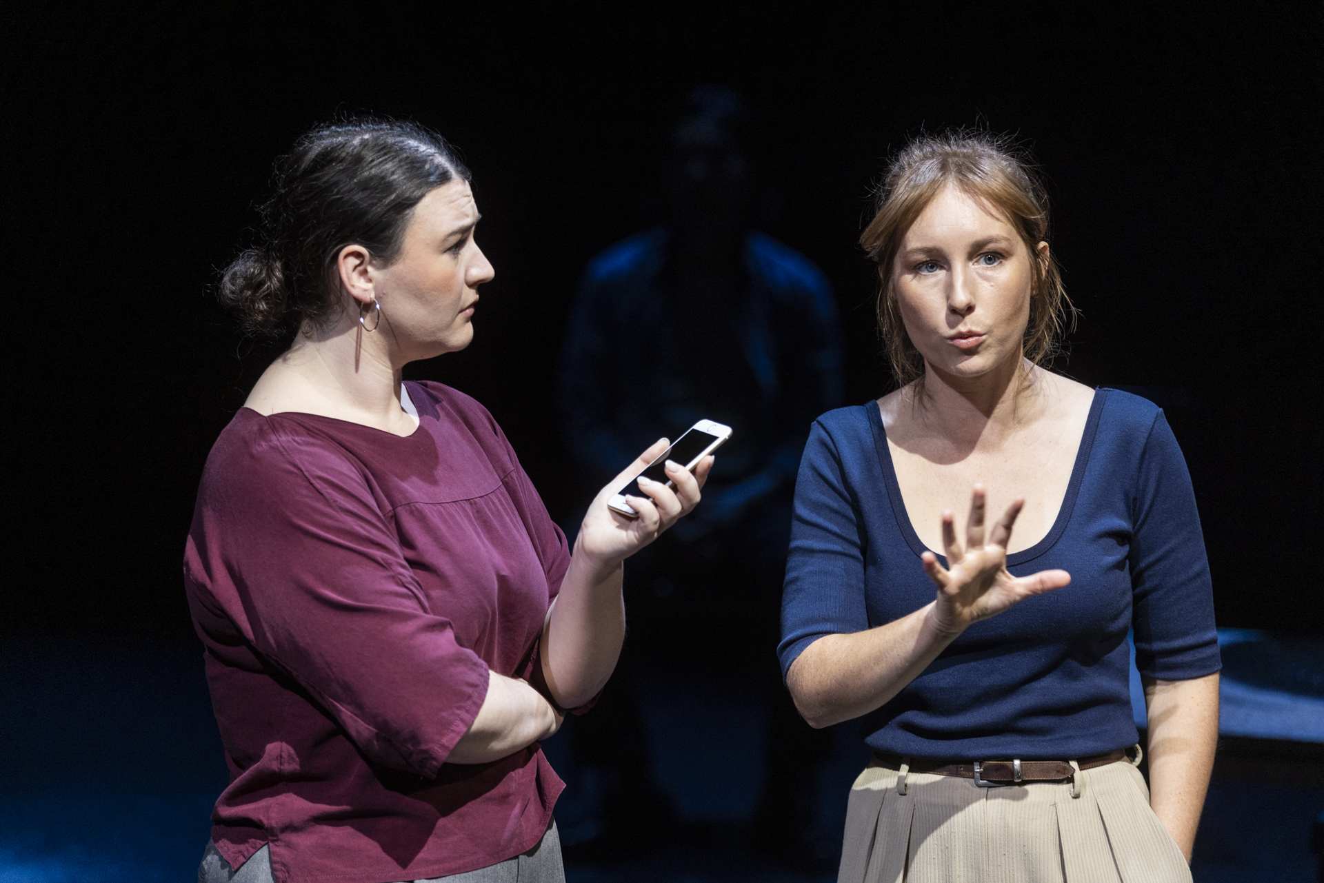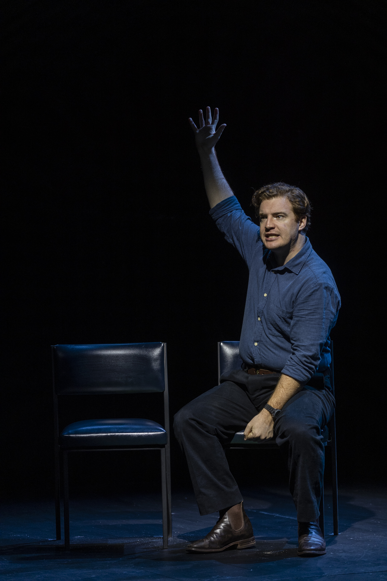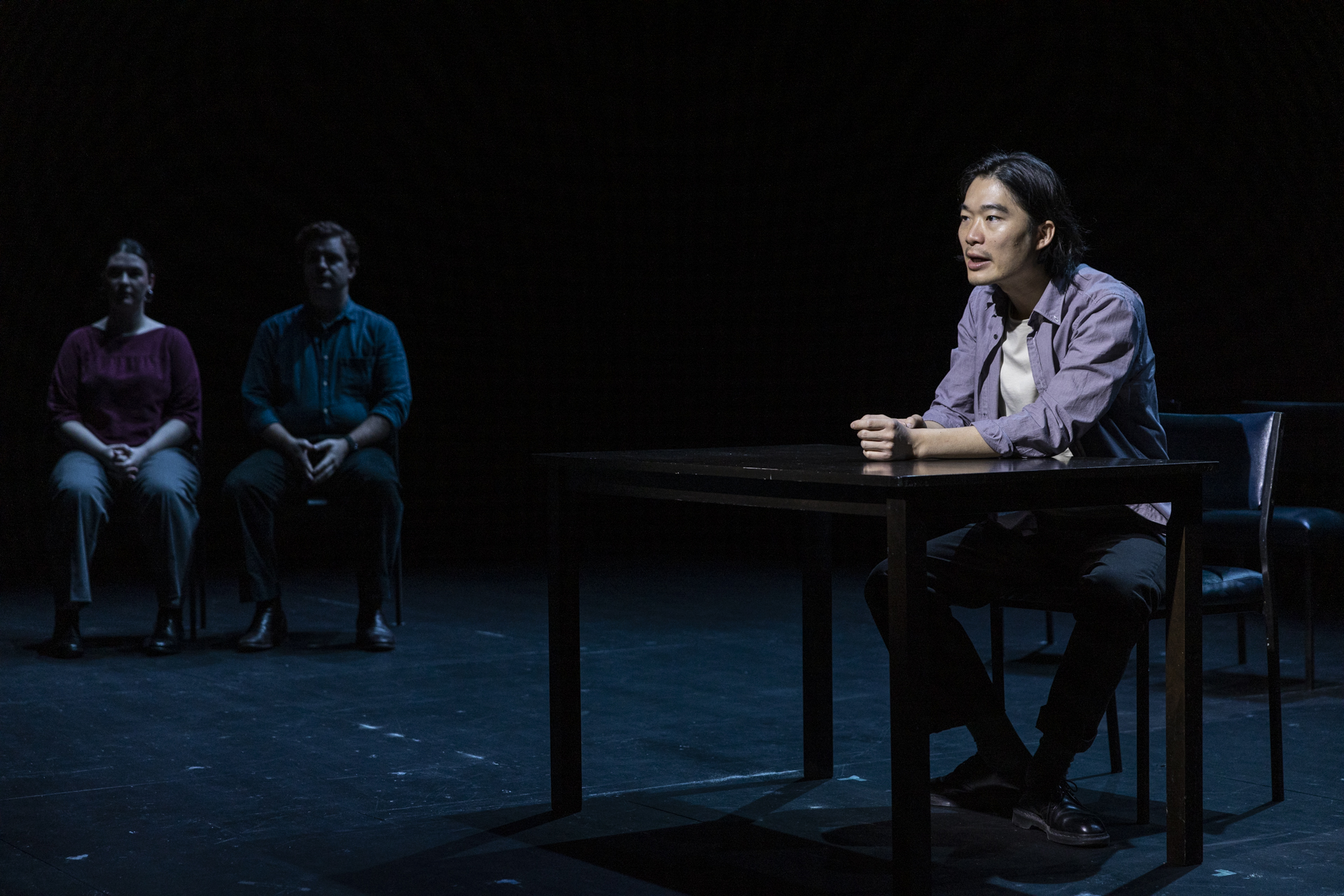 The task for the creative team was an exciting one – the montage form required the design team to create a context in which the scenes would be played out, and thus carry much of the ultimate meaning of the work; and it required us to shape a satisfying journey through the play while embracing its multiplicity. Over several months leading up to rehearsals, David, myself and dramaturg Vaishnavi Suryaprakash worked carefully to refine the scenes and curate what we hoped would be a satisfying shape for the work. At the same time, set and lighting designer Nick Schlieper, and costume designer Ella Butler, Charles Wu, and Harriet Gordon-Anderson and I worked to create a theatrical language that was economical but eloquent, giving us the dexterity to move from one scene to another in an instant, and allowing us to always foreground the dramatic situation. We also sought to realise an environment onstage in which the actors were not fully in control – one that evolved over the course of the production – and one that, we hoped, could allow an audience to sit inside the heart of David’s thesis.